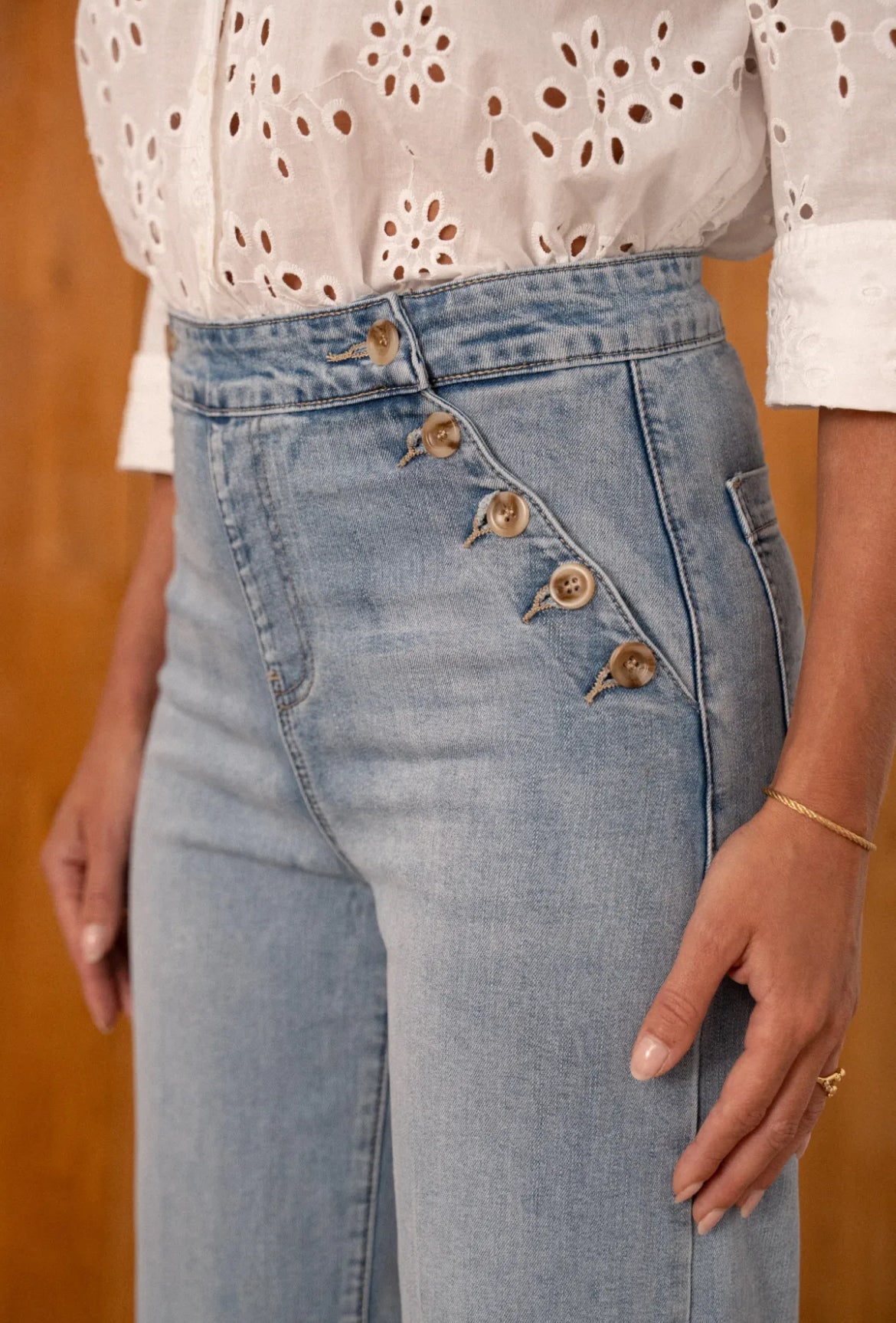 Confectionné dans un denim souple et confortable, il est parfait au quotidien et se porte facilement avec une blouse bohème, une chemise brodée ou un top simple.