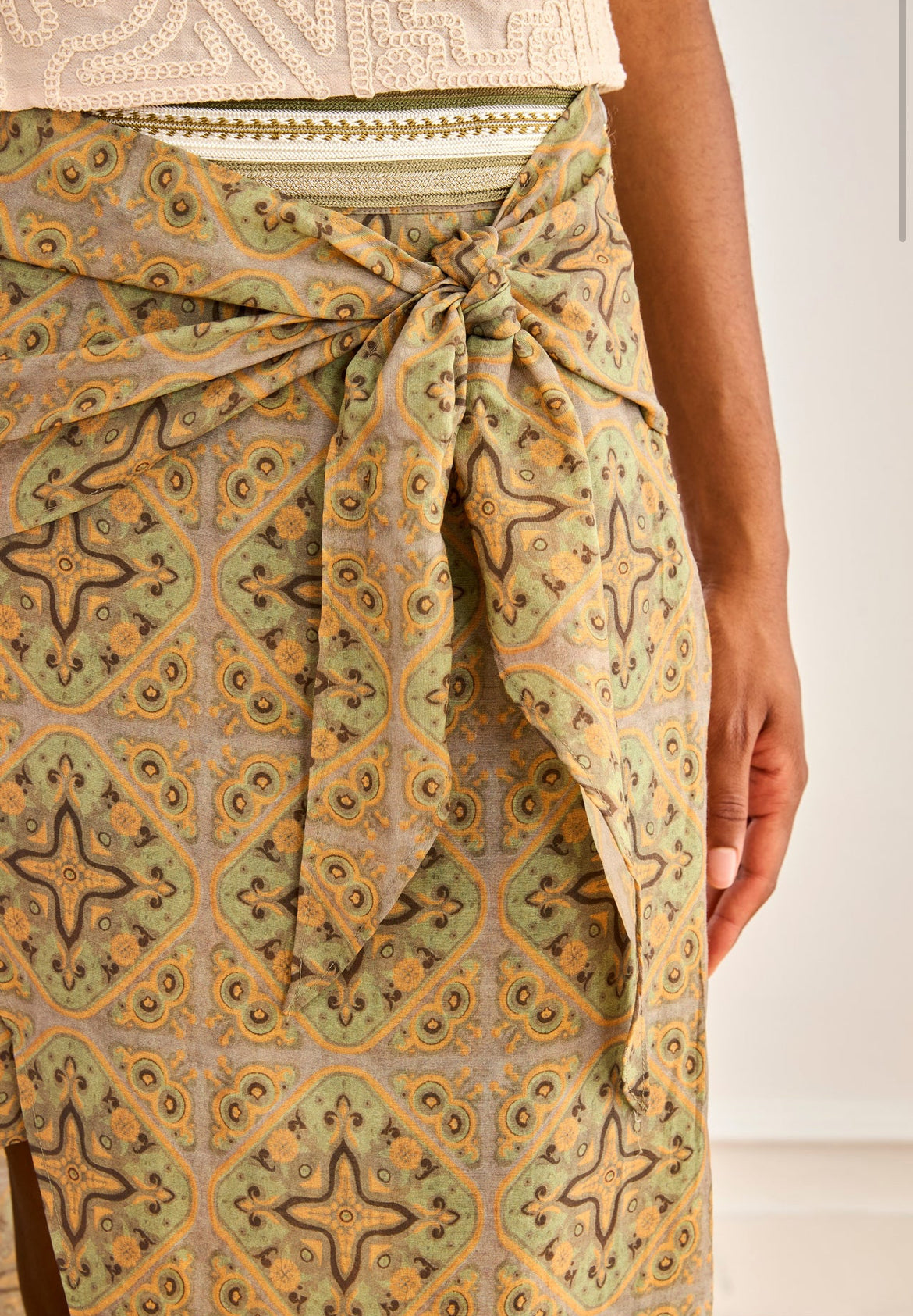 La jupe KORLIT est une pièce bohème chic aux nuances kaki, ocre et beige, parfaite pour une silhouette féminine et élégante.