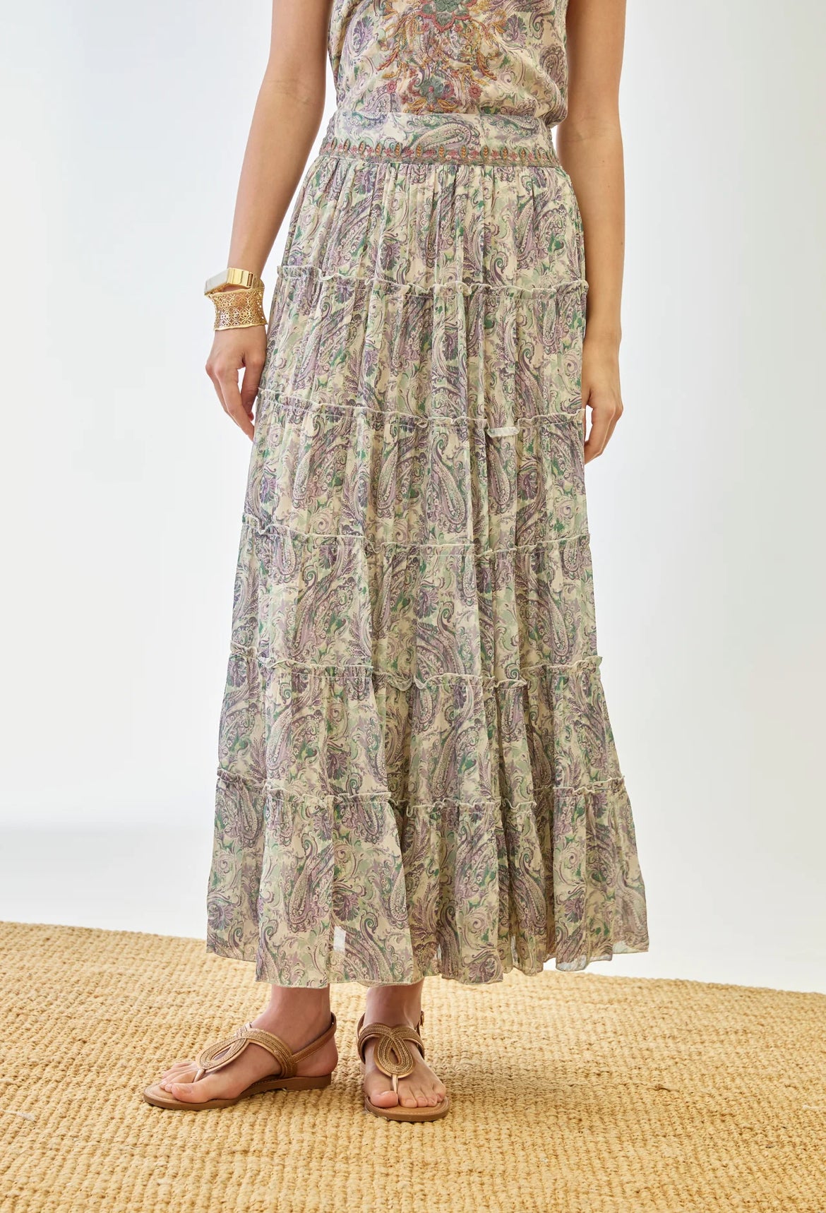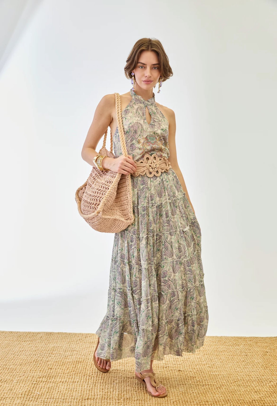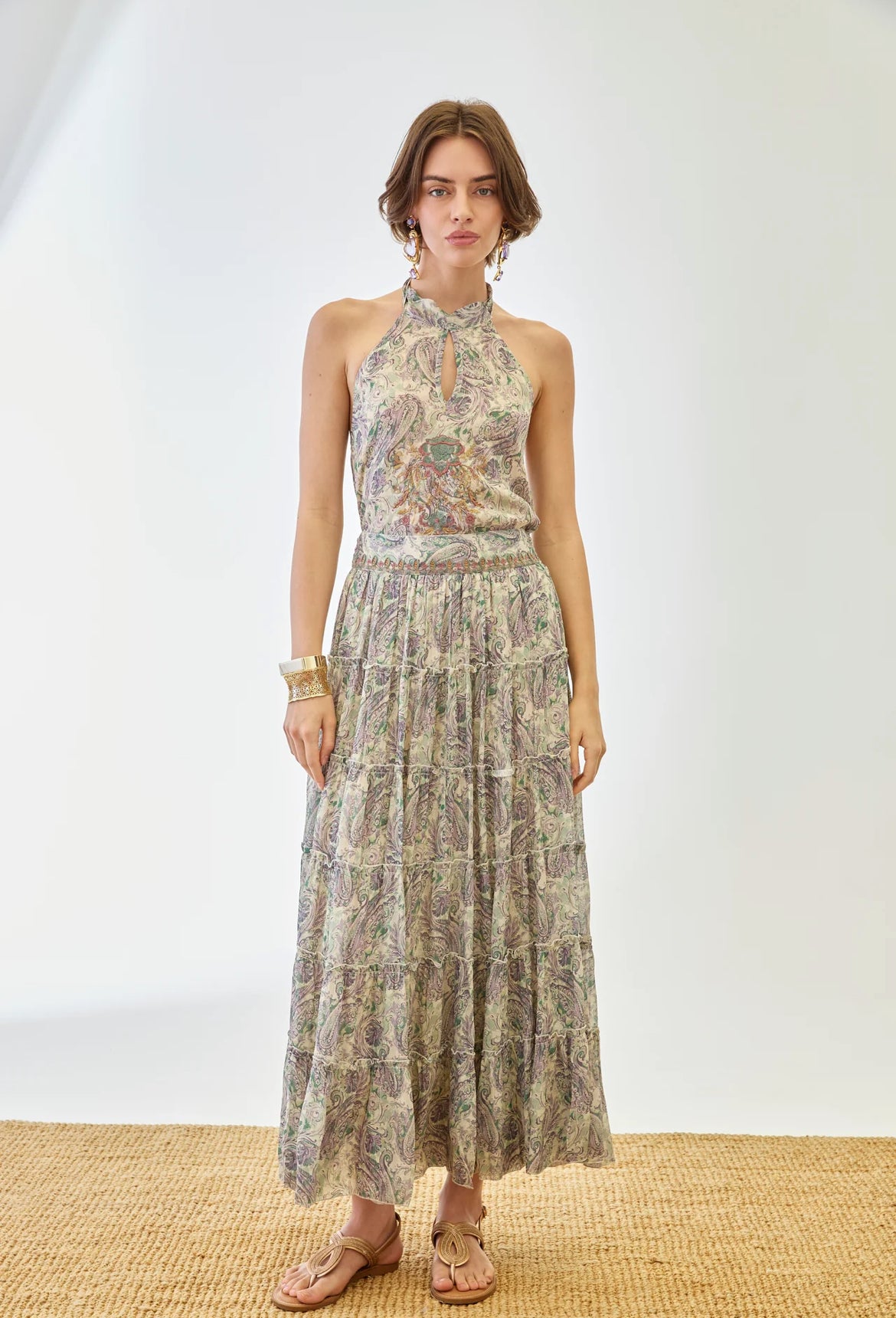 Avec son imprimé cachemire aux nuances vert sauge, beige et touches rosées, elle apporte une allure douce, naturelle et ultra féminine.
