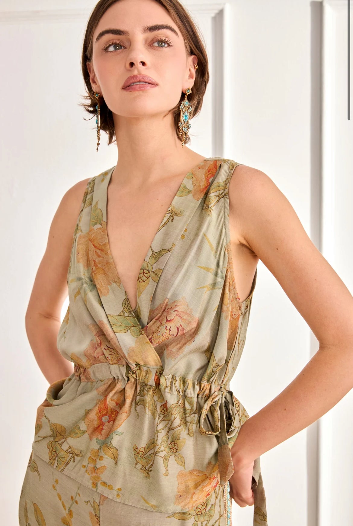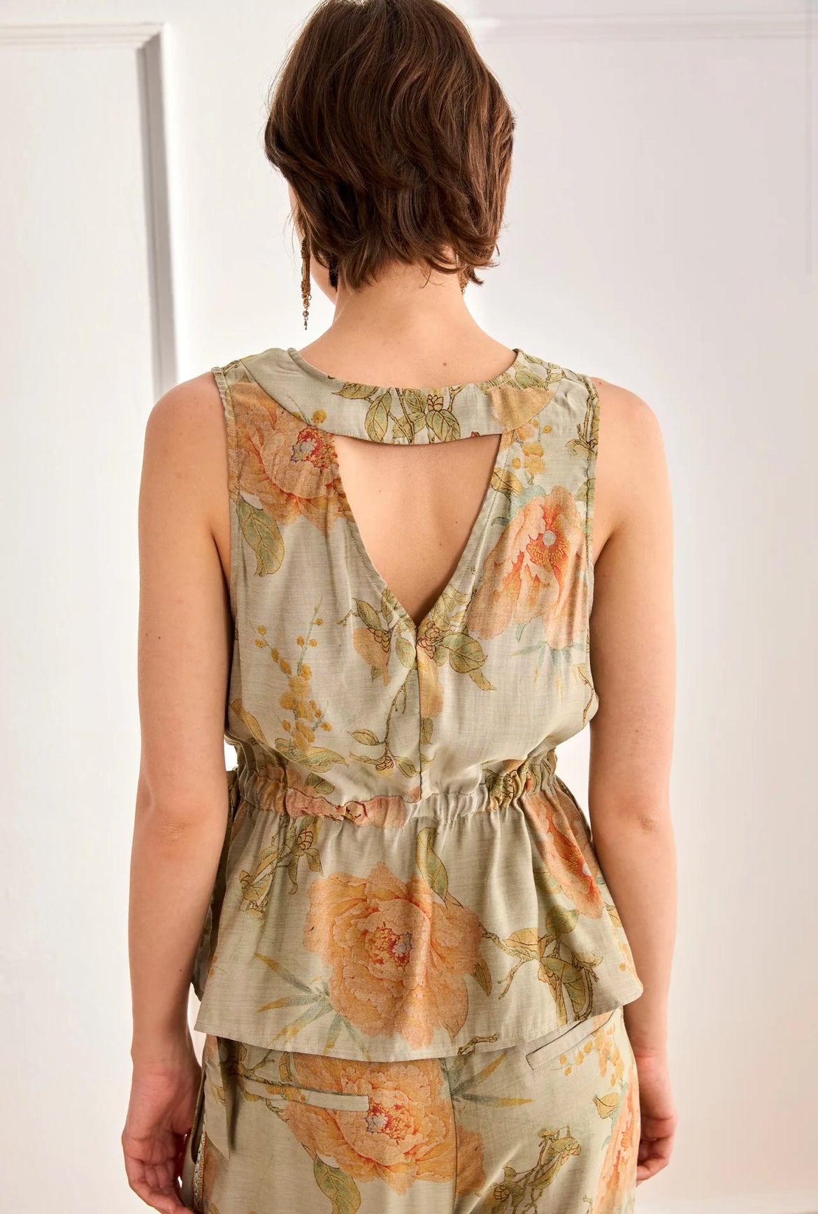 Son imprimé floral aux nuances vert sauge, pêche et ocre illumine la silhouette avec douceur.